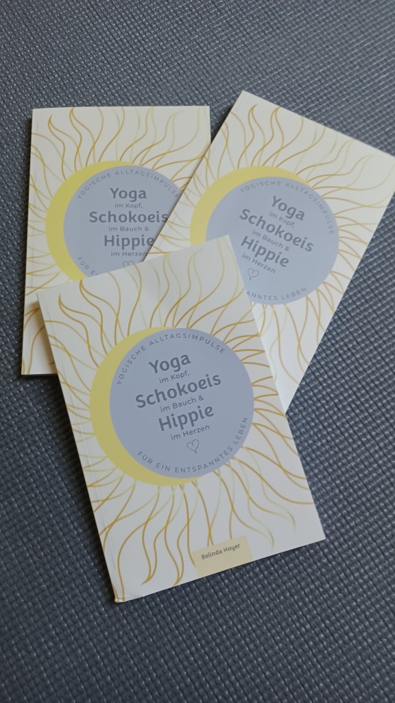 In meinem ersten eigenen Yoga-Buch mit dem Titel „Yoga im Kopf, Schokoeis im Bauch & Hippie im Herzen“ erzähle ich in kurzen Geschichten, wie der Yogaweg mein Leben geprägt hat und er es immer noch tut und wie er auch dir in deinem Leben zu mehr Selbstliebe und Selbstfürsorge helfen kann. Und natürlich sind auch Yogaübungen und yogische Impulse mit dabei – für einen entspannten Alltag. Schreib mir gerne über das Kontaktformular, falls du ein Buch bestellen möchtest. Preis 9,90 €.